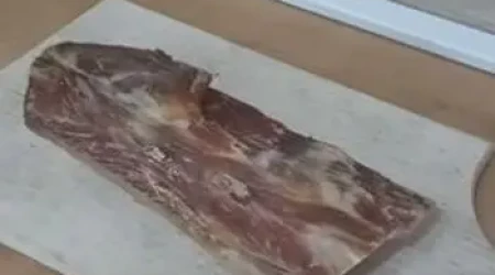 Domaću sušenu svinjsku pečenicu tanko iseći i servirati u drvenom ovalu.