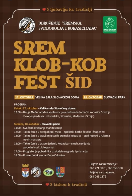 Šid će 17. i 18. oktobra ponovo postati prestonica ukusa, tradicije i takmičarskog duha! Tradicionalna međunarodna manifestacija, 28. po redu „SREM KLOB KOB FEST", biće održana na dve lokacije – u Slovačkom domu i Slovačkom parku – i još jednom pretvoriće ovaj sremski grad u najveću pozornicu gastronomije i običaja regiona.